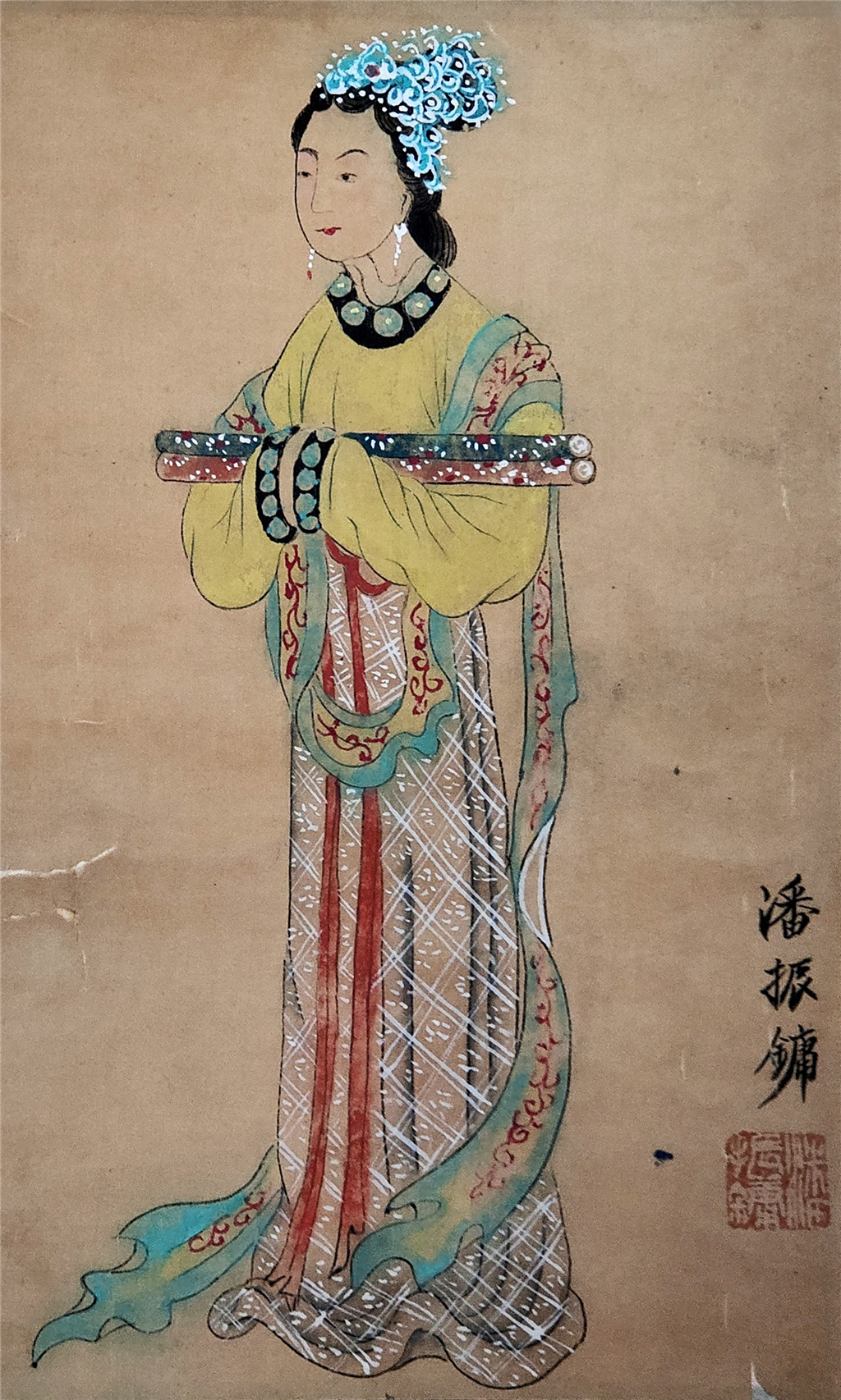 潘振镛(1852-1921),从师钱塘名画家戴以恒,画艺日臻精妙,尤工人物仕女。仕女师法清代画家费丹旭,其人物画与沙山春、吴嘉猷(吴友如)称为“三绝”。